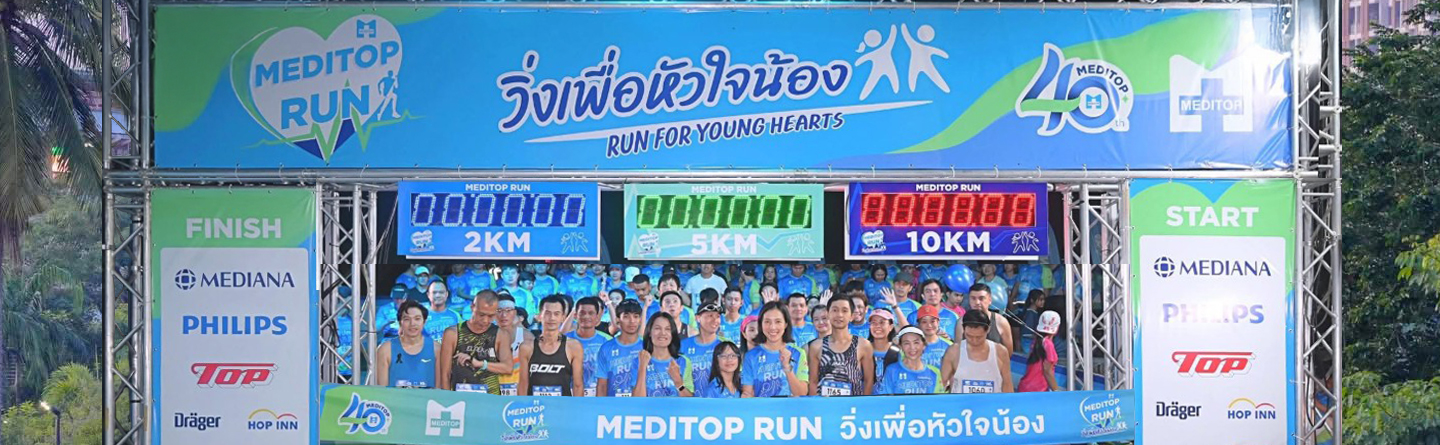 บริษัท เมดิทอป จำกัด จัดกิจกรรมวิ่งการกุศลเนื่องในโอกาสครบรอบ 40 ปี บริษัท เมดิทอป. ในงานกิจกรรมวิ่งการกุศล  MEDITOP RUN วิ่งเพื่อหัวใจน้อง เพื่อนำรายได้ โดยไม่หักค่าใช้จ่าย. มอบให้ “มูลนิธิเพื่อสนับสนุนการผ่าตัดหัวใจเด็ก”  All revenue (without deduction of any expenses) will be donated to the Pediatric Cardiac Surgery Foundation.